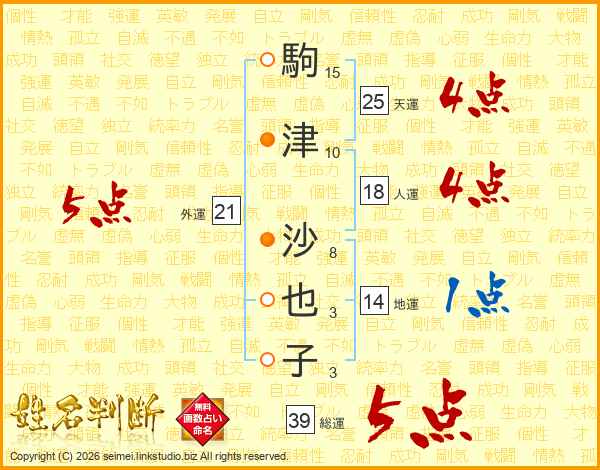 駒(15画)津(10画) 沙(8画)也(3画)子(3画)