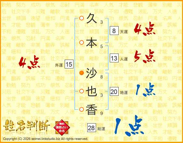 久(3画)本(5画) 沙(8画)也(3画)香(9画)