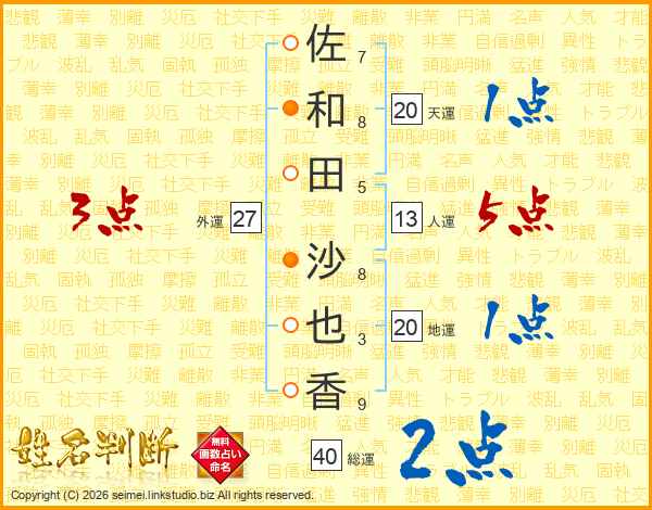 佐(7画)和(8画)田(5画) 沙(8画)也(3画)香(9画)
