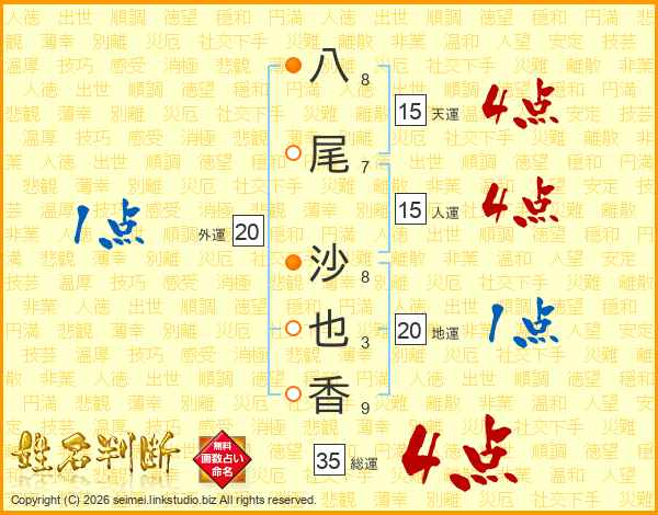 八(8画)尾(7画) 沙(8画)也(3画)香(9画)
