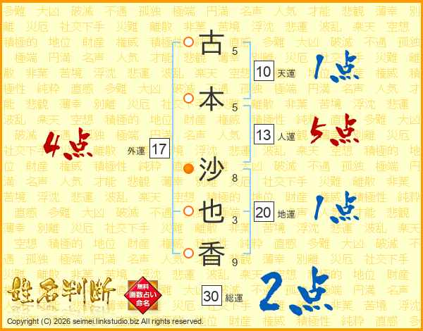 古(5画)本(5画) 沙(8画)也(3画)香(9画)