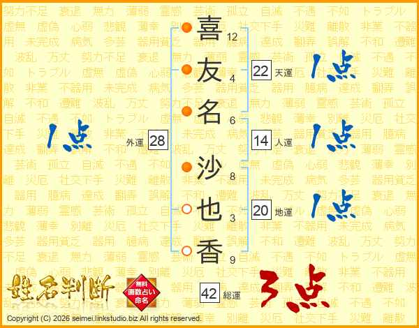 喜(12画)友(4画)名(6画) 沙(8画)也(3画)香(9画)