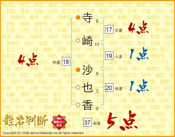 寺(6画)崎(11画) 沙(8画)也(3画)香(9画)