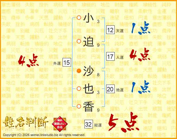 小(3画)迫(9画) 沙(8画)也(3画)香(9画)