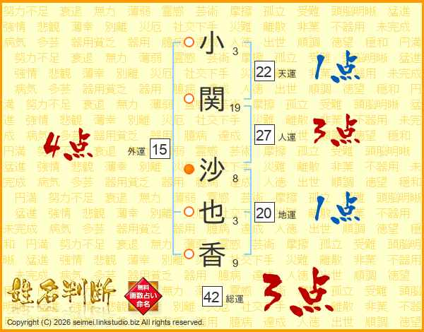 小(3画)関(19画) 沙(8画)也(3画)香(9画)