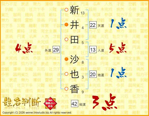 新(13画)井(4画)田(5画) 沙(8画)也(3画)香(9画)