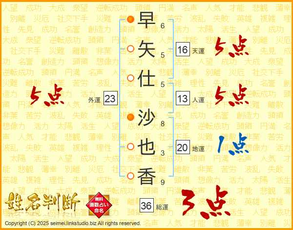 早(6画)矢(5画)仕(5画) 沙(8画)也(3画)香(9画)
