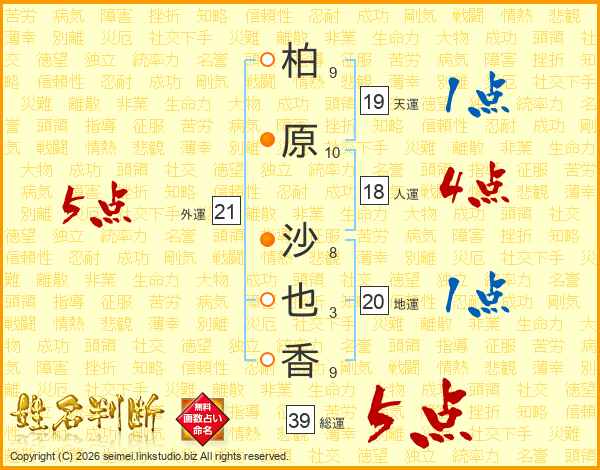 柏(9画)原(10画) 沙(8画)也(3画)香(9画)