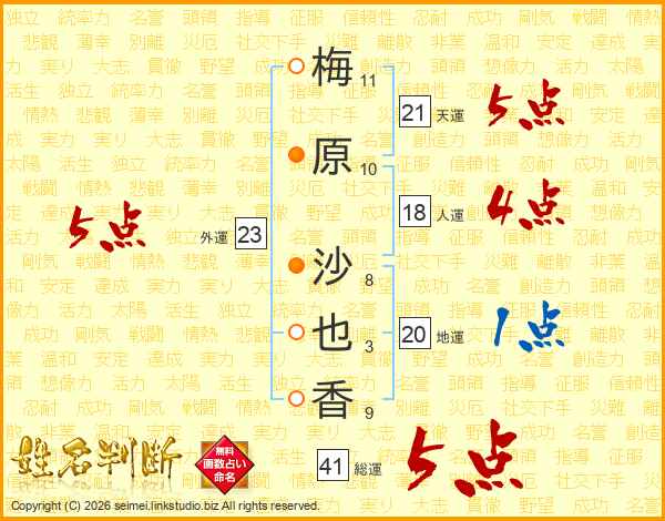 梅(11画)原(10画) 沙(8画)也(3画)香(9画)
