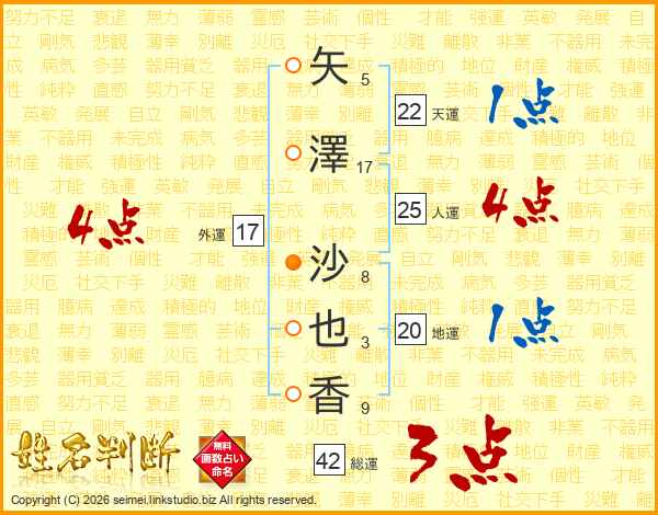 矢(5画)澤(17画) 沙(8画)也(3画)香(9画)