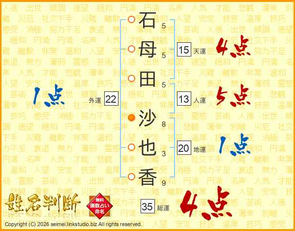 石(5画)母(5画)田(5画) 沙(8画)也(3画)香(9画)