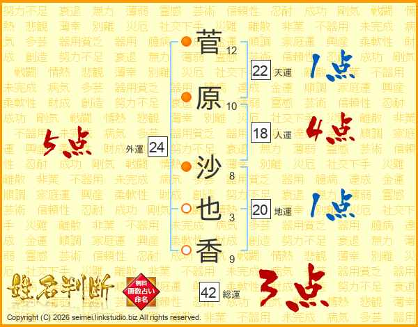 菅(12画)原(10画) 沙(8画)也(3画)香(9画)