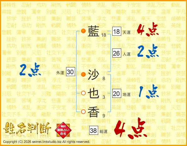 藍(18画) 沙(8画)也(3画)香(9画)