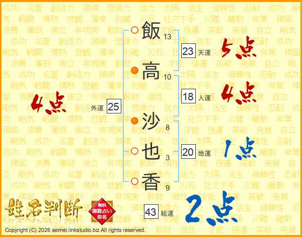 飯(13画)高(10画) 沙(8画)也(3画)香(9画)