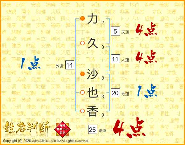 力(2画)久(3画) 沙(8画)也(3画)香(9画)