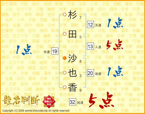 杉(7画)田(5画) 沙(8画)也(3画)香(9画)