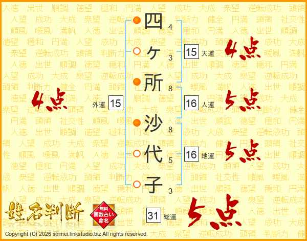 四(4画)ヶ(3画)所(8画) 沙(8画)代(5画)子(3画)