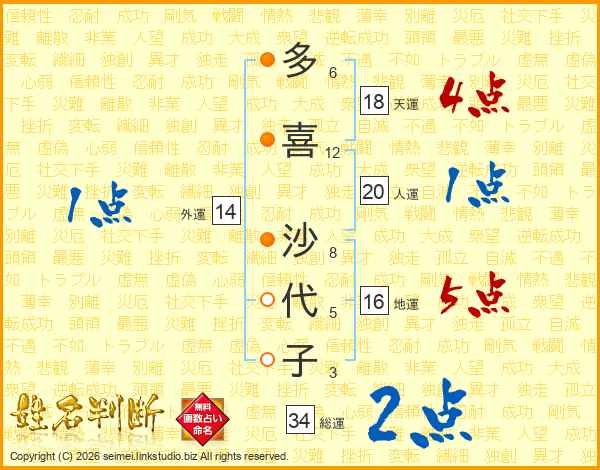 多(6画)喜(12画) 沙(8画)代(5画)子(3画)
