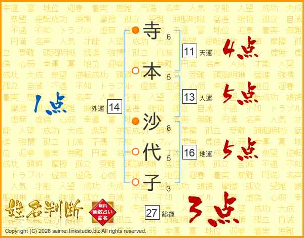 寺(6画)本(5画) 沙(8画)代(5画)子(3画)