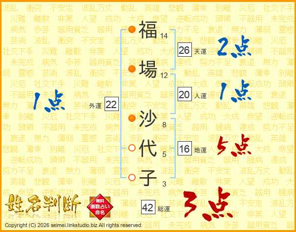 福(14画)場(12画) 沙(8画)代(5画)子(3画)