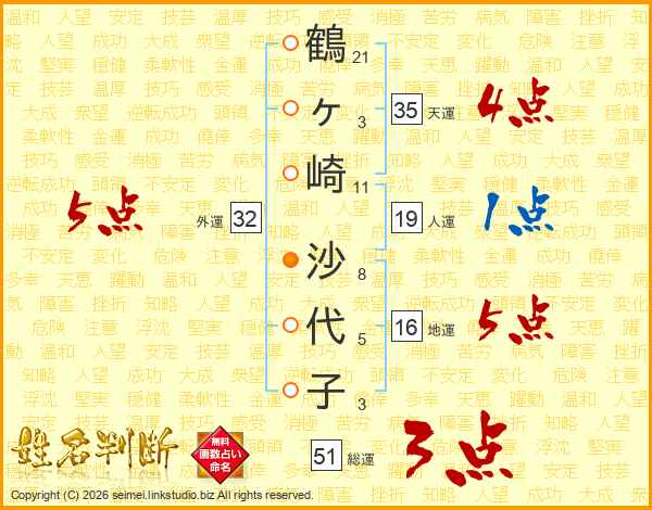 鶴ヶ崎沙代子さんの総運は51画の3点!