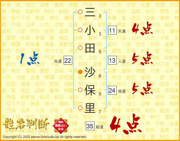 三(3画)小(3画)田(5画) 沙(8画)保(9画)里(7画)