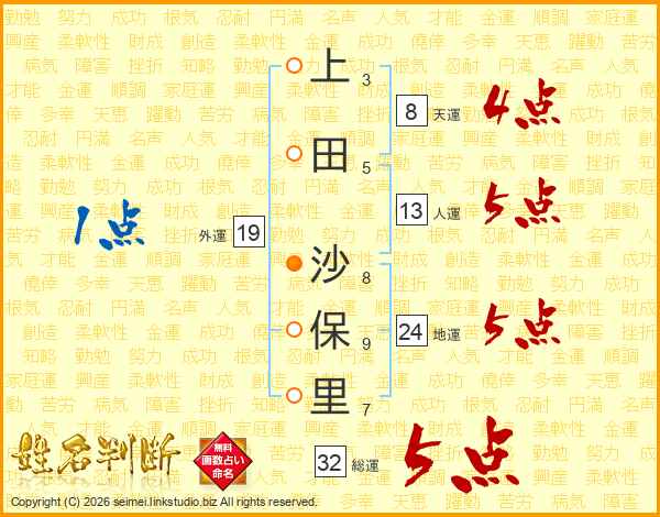 上(3画)田(5画) 沙(8画)保(9画)里(7画)