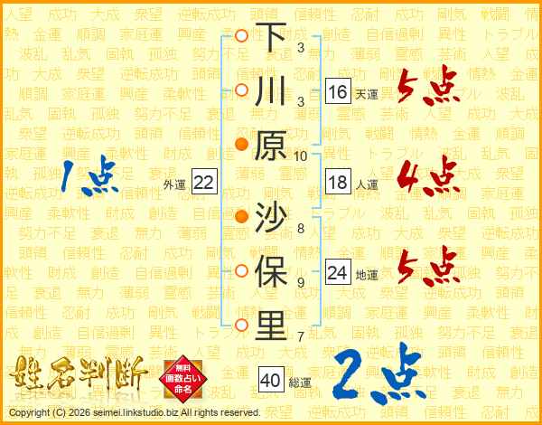 下川原沙保里さんの総運は40画の2点!