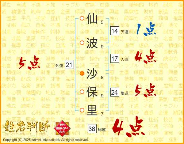 仙(5画)波(9画) 沙(8画)保(9画)里(7画)