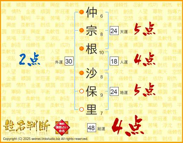 仲(6画)宗(8画)根(10画) 沙(8画)保(9画)里(7画)