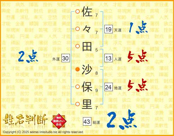佐(7画)々(7画)田(5画) 沙(8画)保(9画)里(7画)