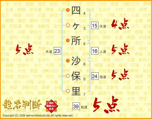 四ヶ所沙保里さんの総運は39画の5点!