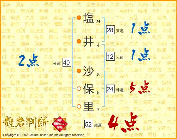 塩(24画)井(4画) 沙(8画)保(9画)里(7画)