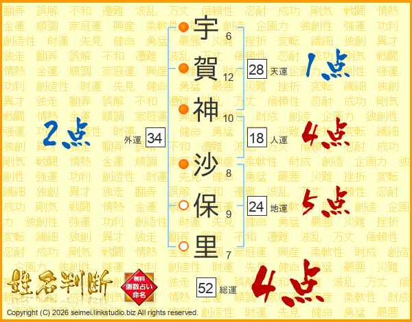 宇(6画)賀(12画)神(10画) 沙(8画)保(9画)里(7画)