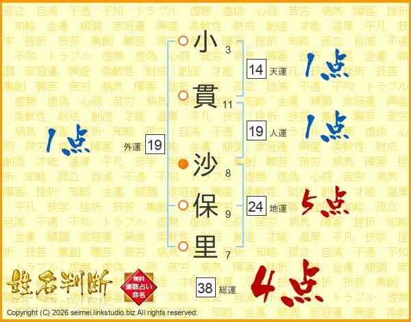 小貫沙保里さんの総運は38画の4点!
