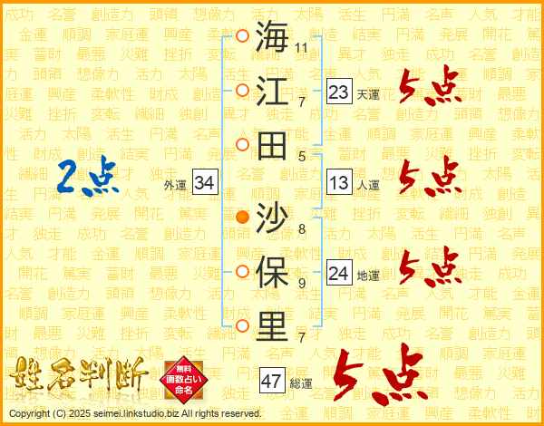 海(11画)江(7画)田(5画) 沙(8画)保(9画)里(7画)