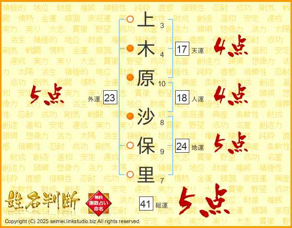 上(3画)木(4画)原(10画) 沙(8画)保(9画)里(7画)