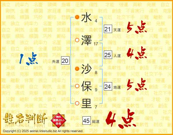 水(4画)澤(17画) 沙(8画)保(9画)里(7画)