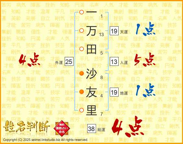 一(1画)万(13画)田(5画) 沙(8画)友(4画)里(7画)