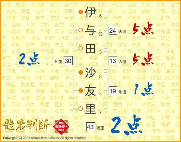 伊(6画)与(13画)田(5画) 沙(8画)友(4画)里(7画)