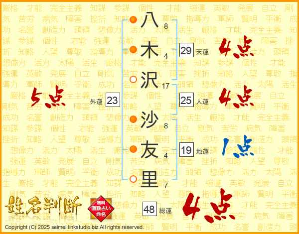八(8画)木(4画)沢(17画) 沙(8画)友(4画)里(7画)