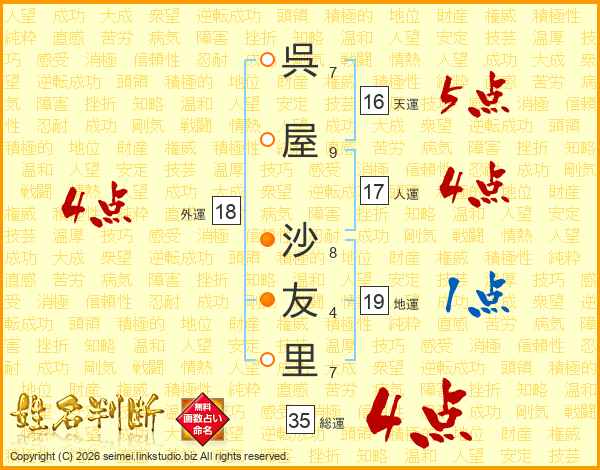 呉(7画)屋(9画) 沙(8画)友(4画)里(7画)