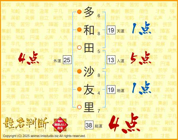 多(6画)和(8画)田(5画) 沙(8画)友(4画)里(7画)