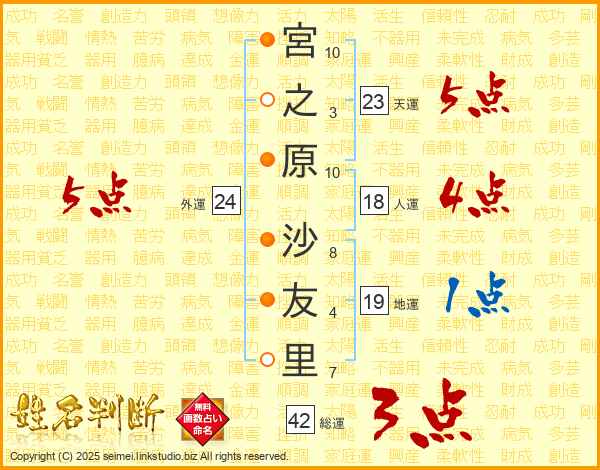 宮(10画)之(3画)原(10画) 沙(8画)友(4画)里(7画)