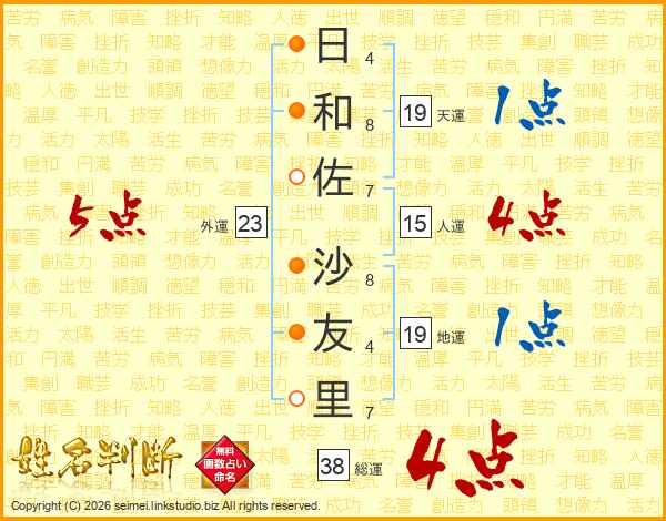 日(4画)和(8画)佐(7画) 沙(8画)友(4画)里(7画)