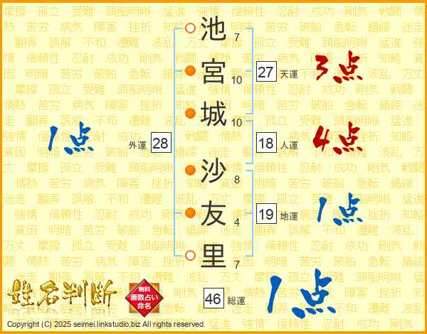 池(7画)宮(10画)城(10画) 沙(8画)友(4画)里(7画)