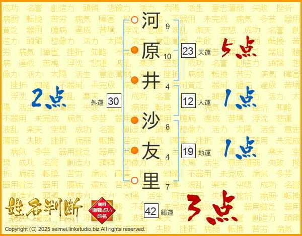 河(9画)原(10画)井(4画) 沙(8画)友(4画)里(7画)