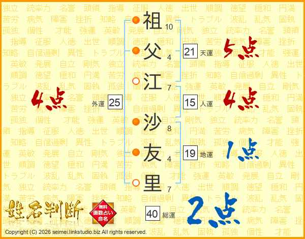 祖(10画)父(4画)江(7画) 沙(8画)友(4画)里(7画)