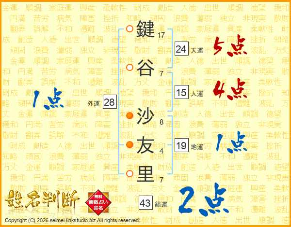 鍵谷沙友里さんの総運は43画の2点!