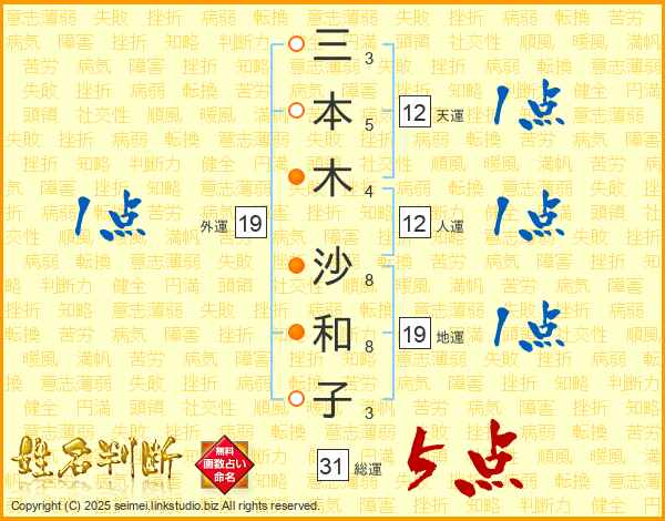 三(3画)本(5画)木(4画) 沙(8画)和(8画)子(3画)
